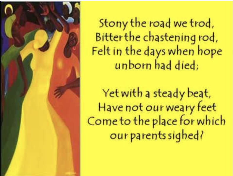 In a similar fashion, the hymn, “Lift Every Voice and Sing” (ELW 841) continues to uphold God’s people. Last year after having a long conversation about the hymn and how it should be sung, a dear friend of mine, Pastor Bradley Schmeling, who serves Gloria Dei Lutheran Church in St. Paul, MN, wrote these words: “Lift Every Voice and Sing” is considered to be the Black National Anthem, because it contains a history that must not be forgotten. The hymn, in both tune and text, names the ongoing wound and grief carried by those descended from enslaved people. Yet it begins with “Lift EVERY Voice and Sing.” This is not the wound of one particular people, “their” history, but the history of all who bear the wounds of white supremacy, including people of European ancestry. The racial divide in the United States, the acknowledged grief, and the societal structures that make supremacy invisible to many, hurt all of us. In a time when the government is systematically erasing the history of Black Americans from public view, singing this hymn, experiencing the poetry of James Weldon Johnson as truth, and recognizing the sacred role this hymn plays in African-American life is an act of prophetic resistance, repentance, and solidarity with every part of God’s beloved community. It should be sung intentionally, reverently, boldly, and at a pace that allows us to take in the deep experience that it represents.”